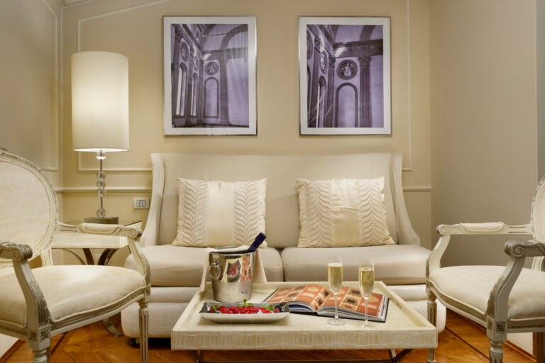 Verborgen an einer Ecke des Hotelkorridors, von dem aus Sie eine herrliche Aussicht haben, wird Sie die Balcony Suite mit ihrem unerwarteten Charme und dem atemberaubenden Ausblick verzaubern: Eine kleine, gemütliche Terrasse bietet Ihnen einen außergewöhnlichen Blick auf die Dächer von Florenz und den prächtigen Palazzo Vecchio, während Sie von einem geheimen Fenster aus direkt auf die Kuppel des Hotel Brunelleschi sehen können. Außerdem haben Sie durch die versteckte Lage und die Möglichkeit, den wahren florentiner Lebensstil zu erfahren!